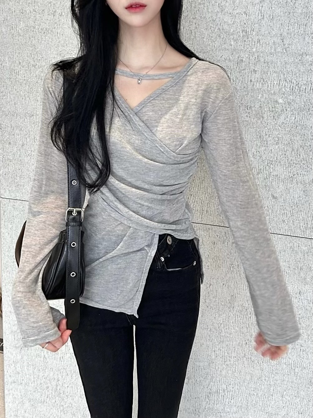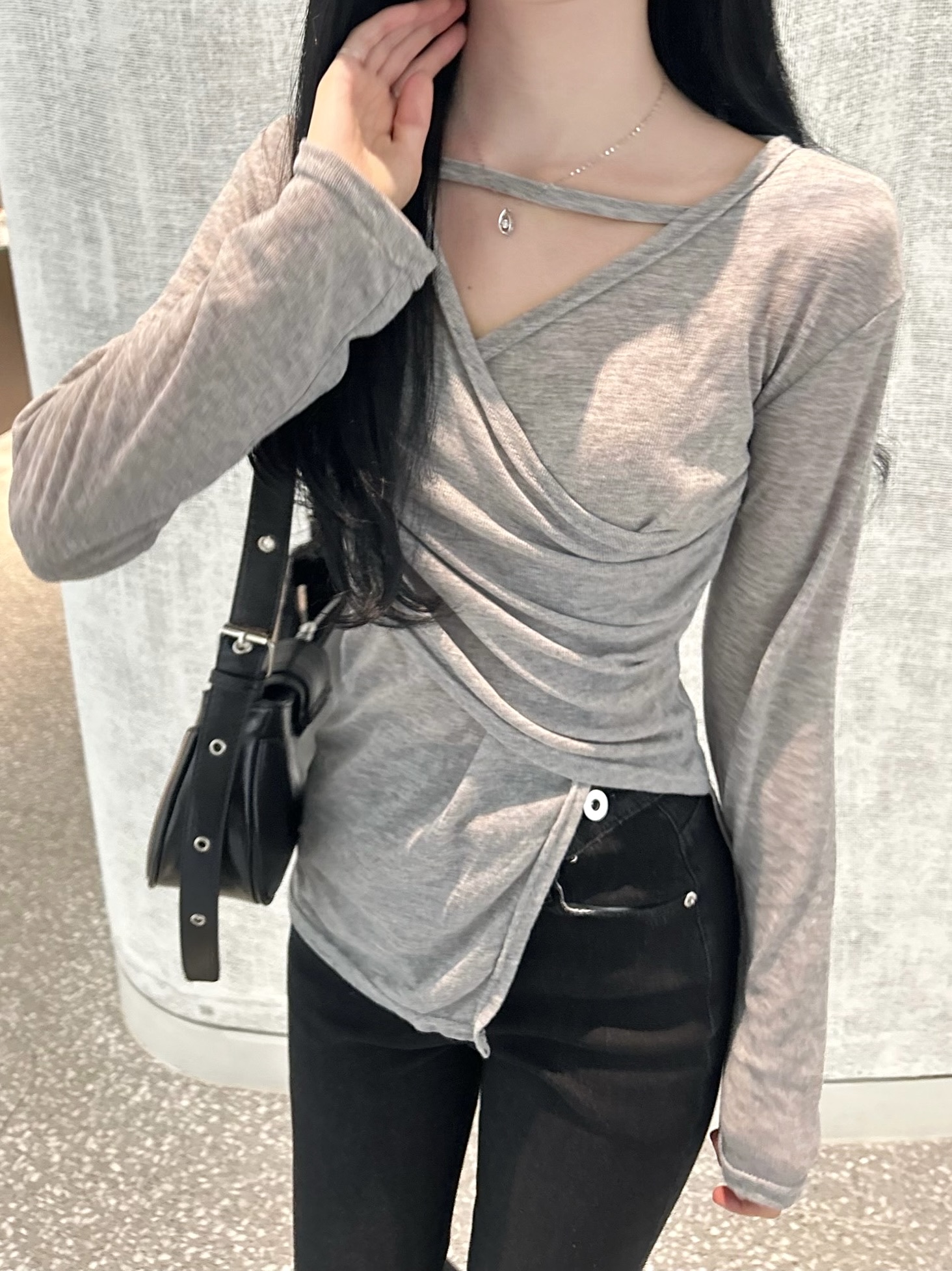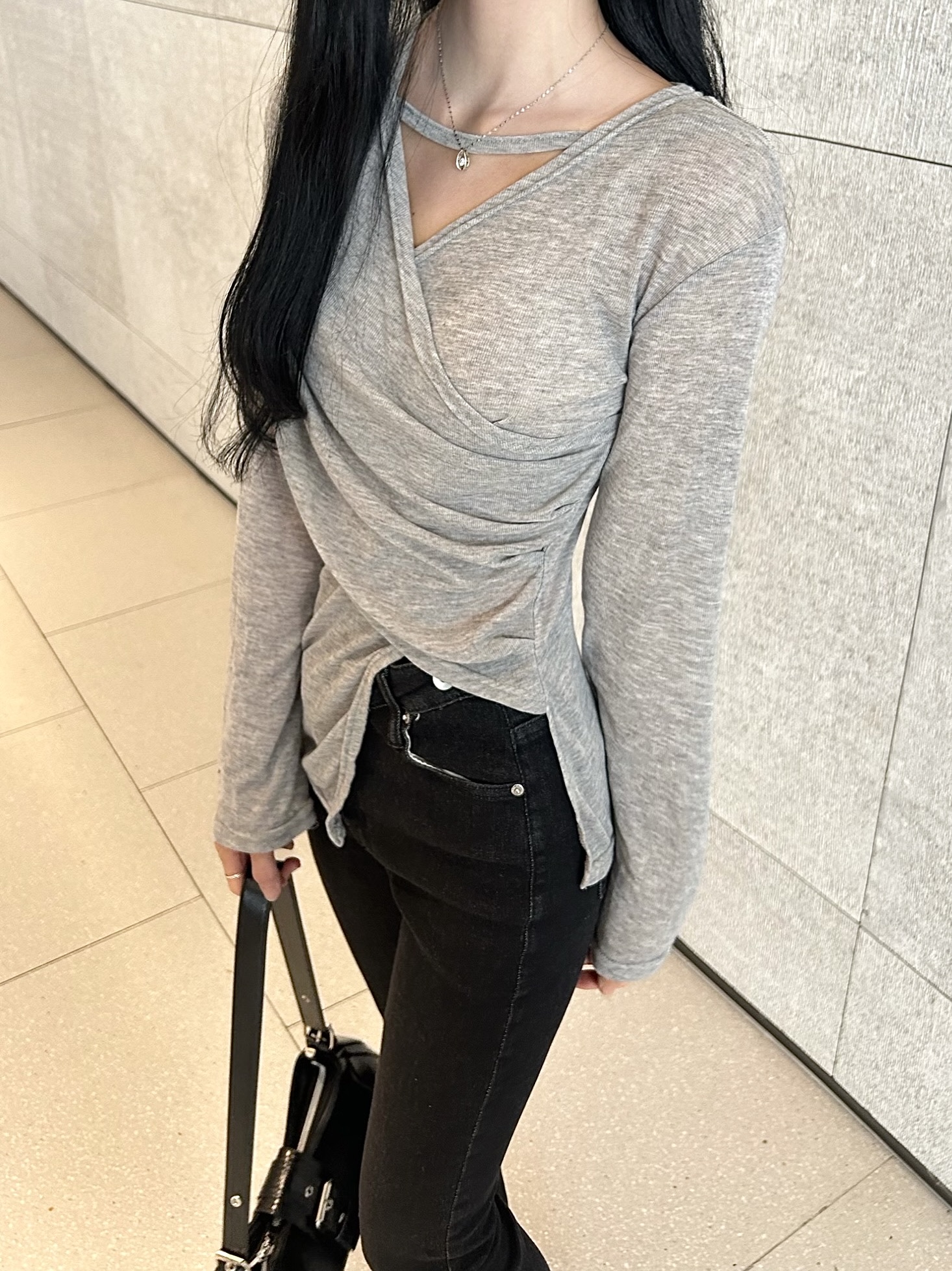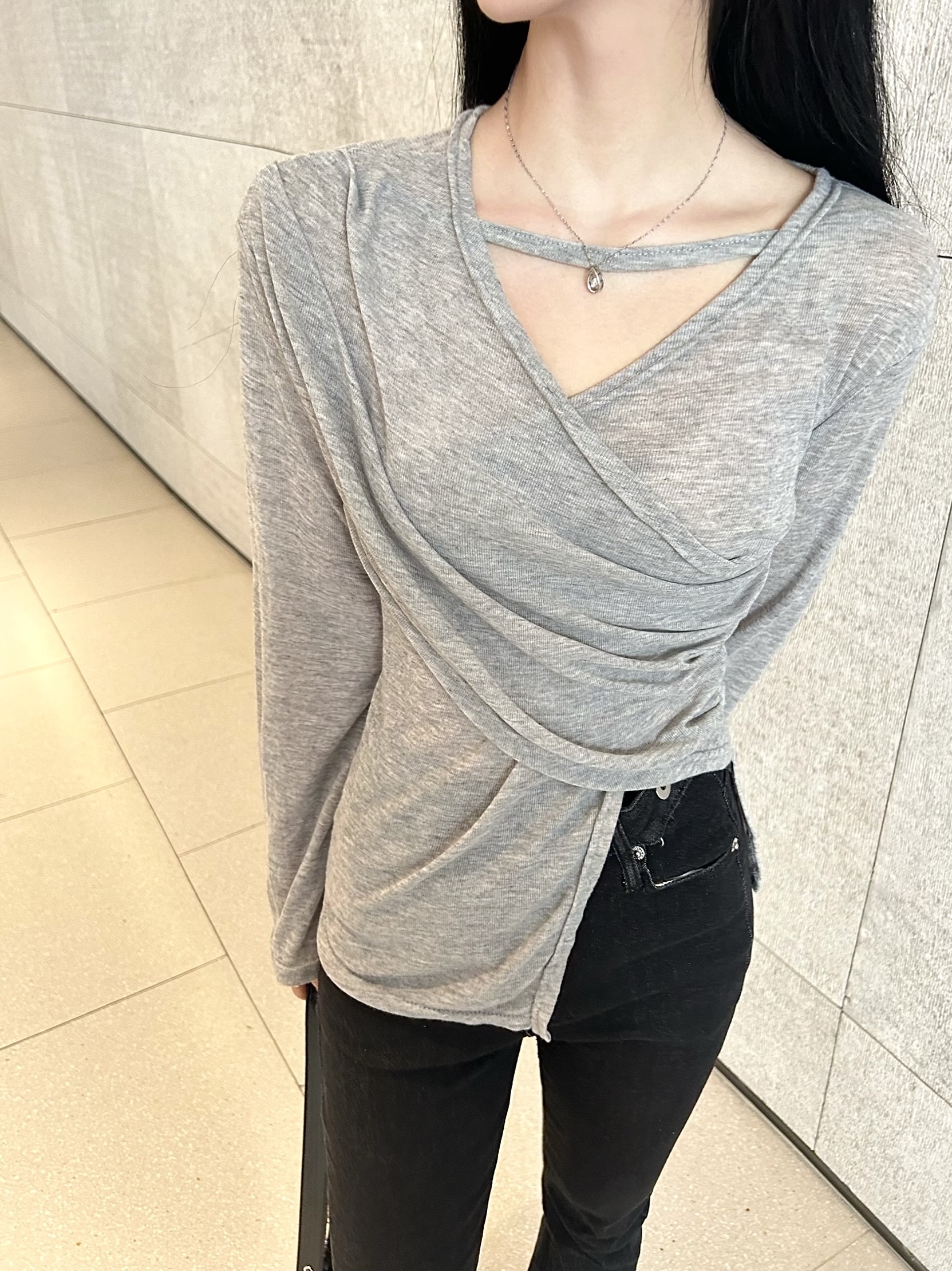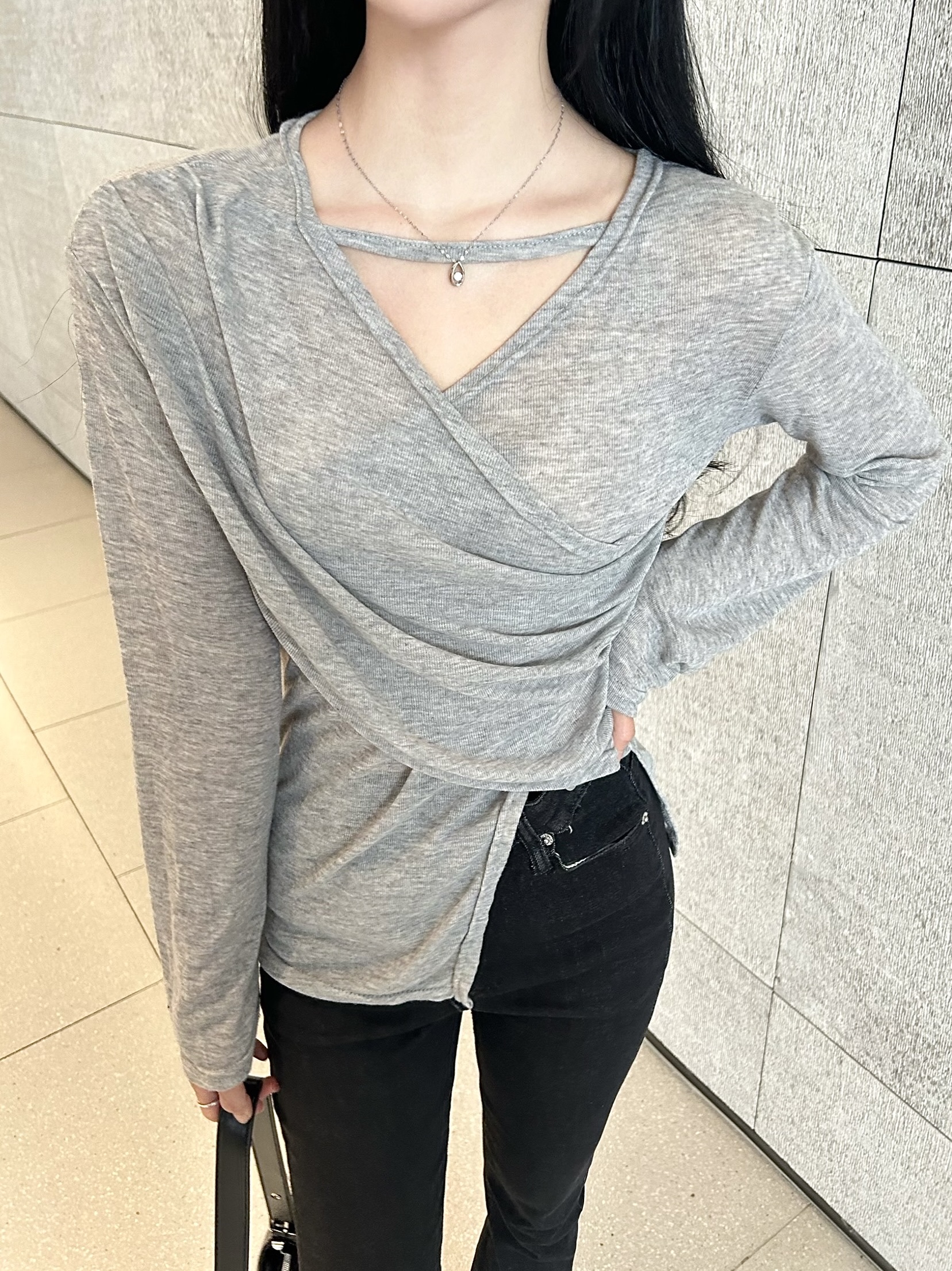 ✓ 목선과 쇄골라인이 강조되는 브이 넥 라인