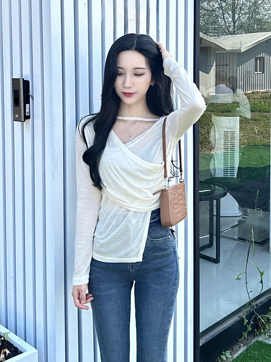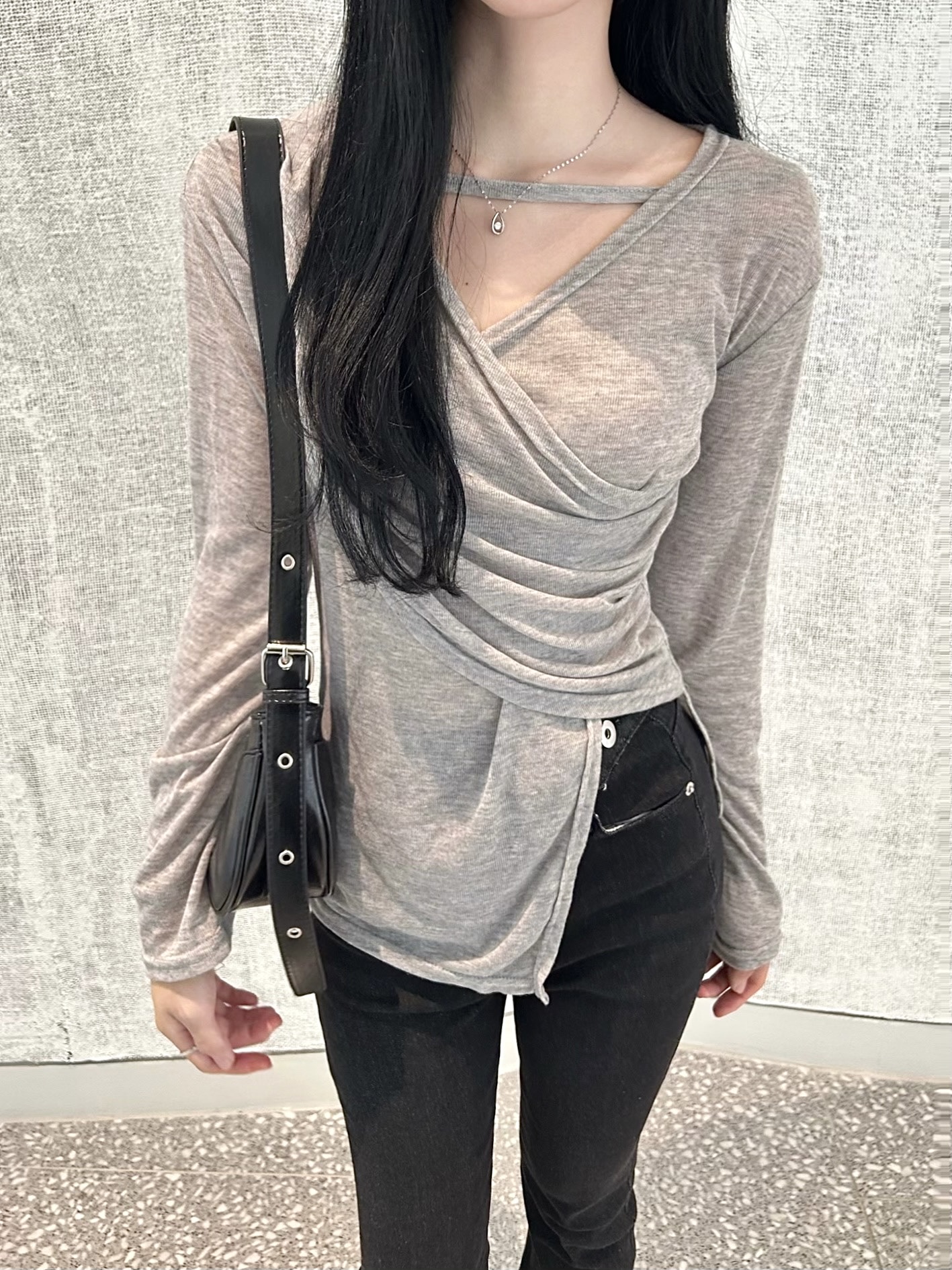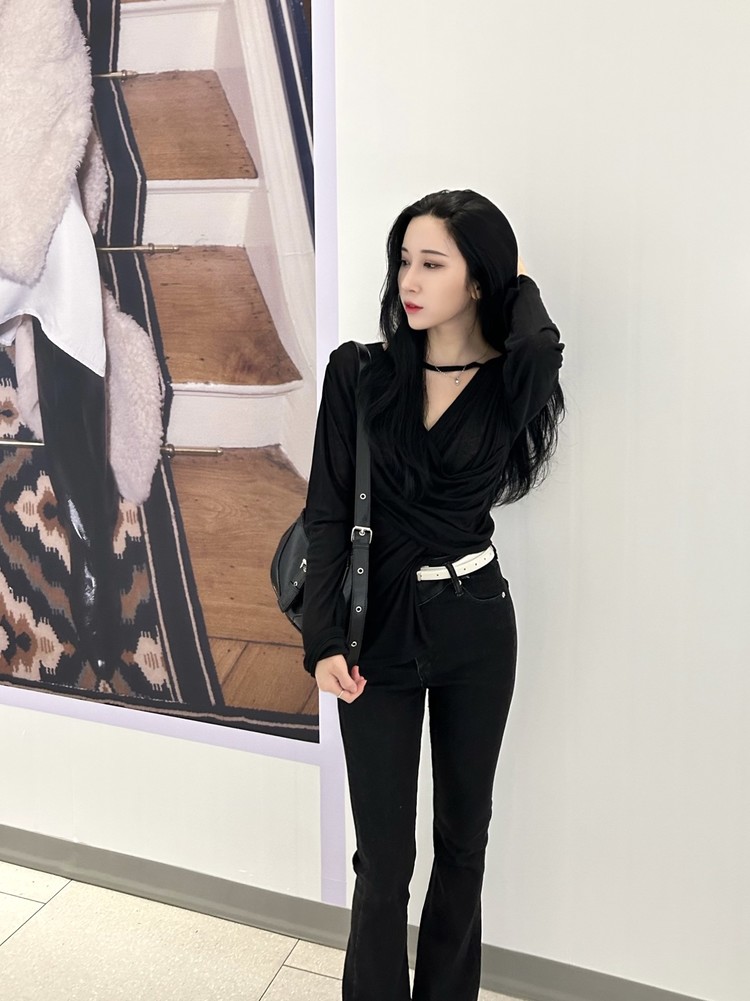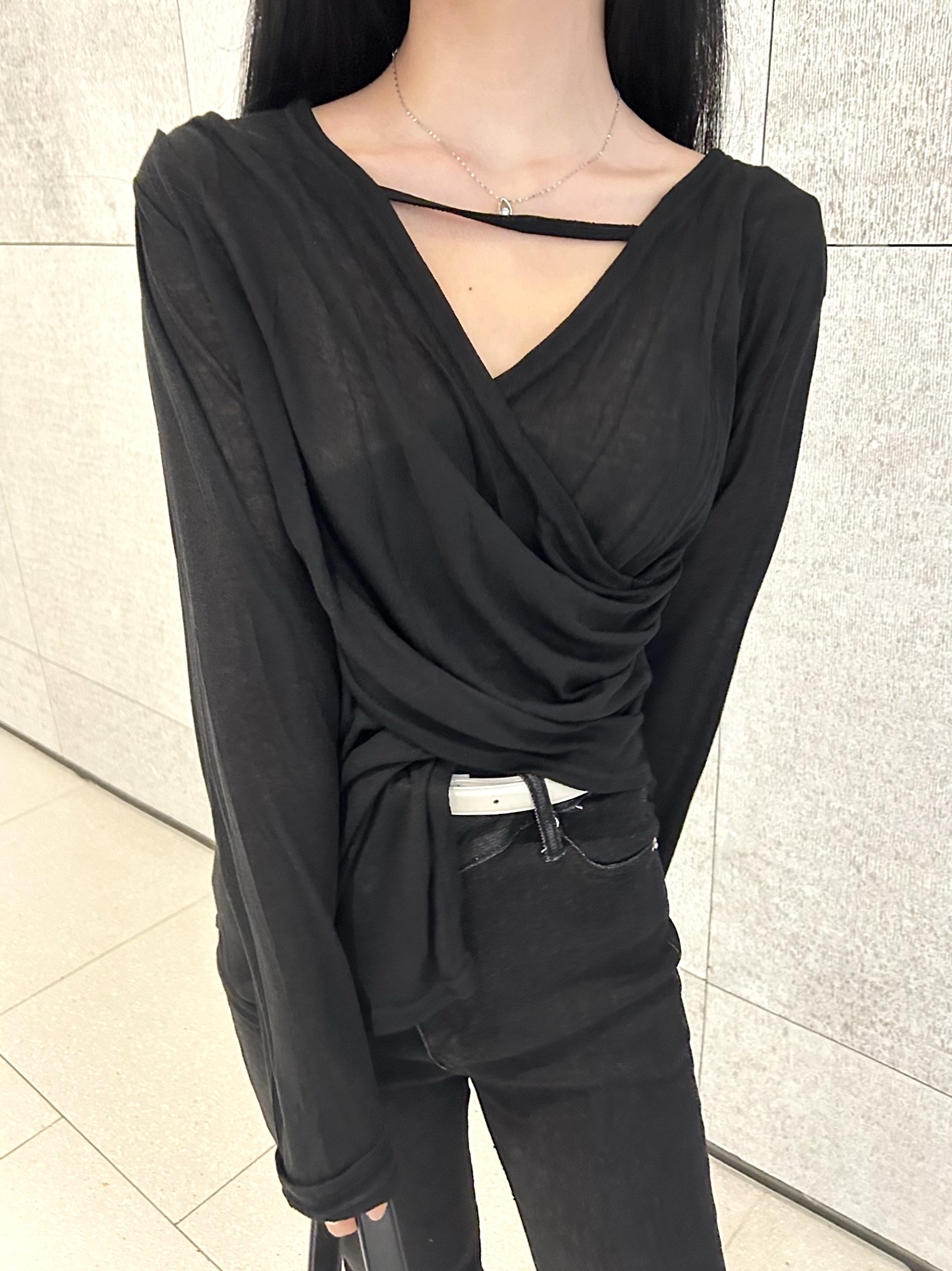 ✓ 목선과 쇄골라인이 강조되는 브이 넥 라인