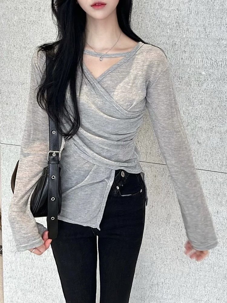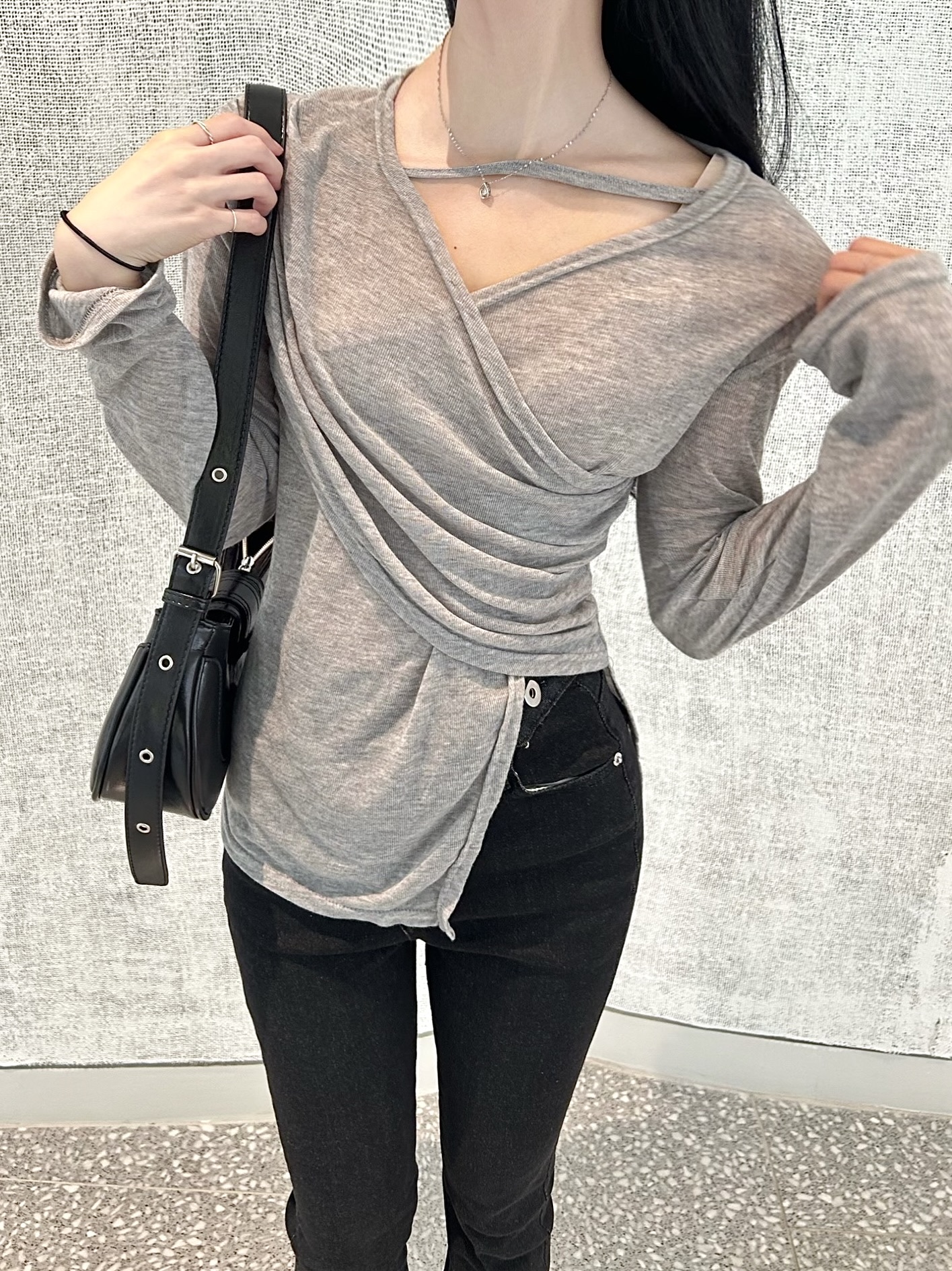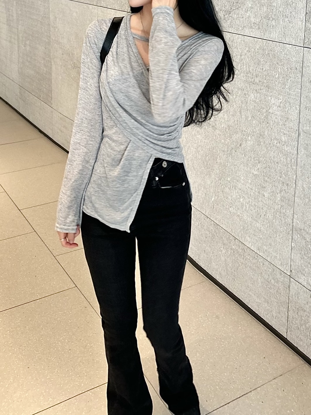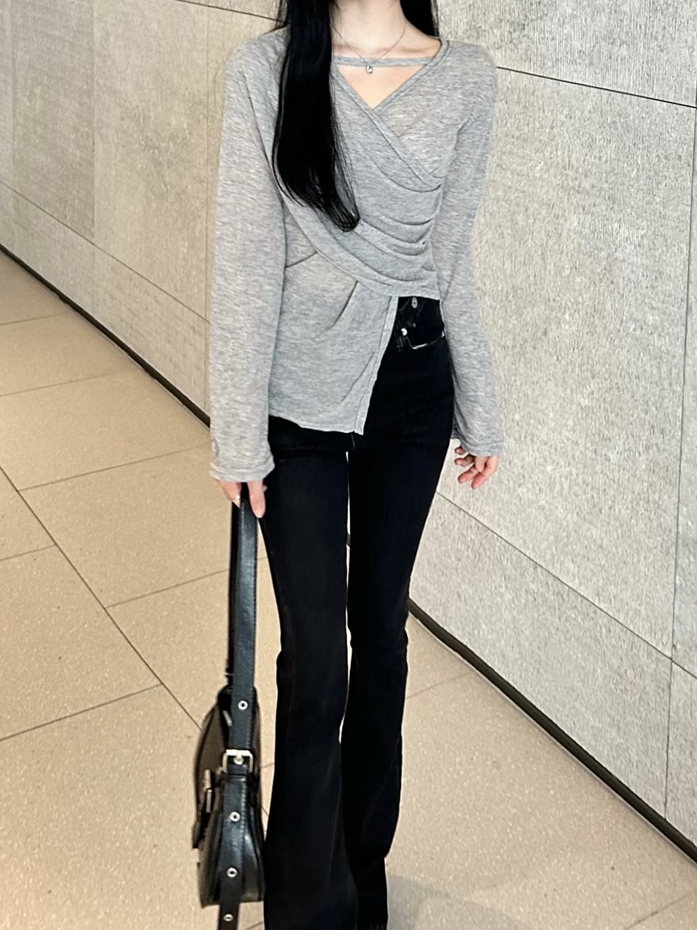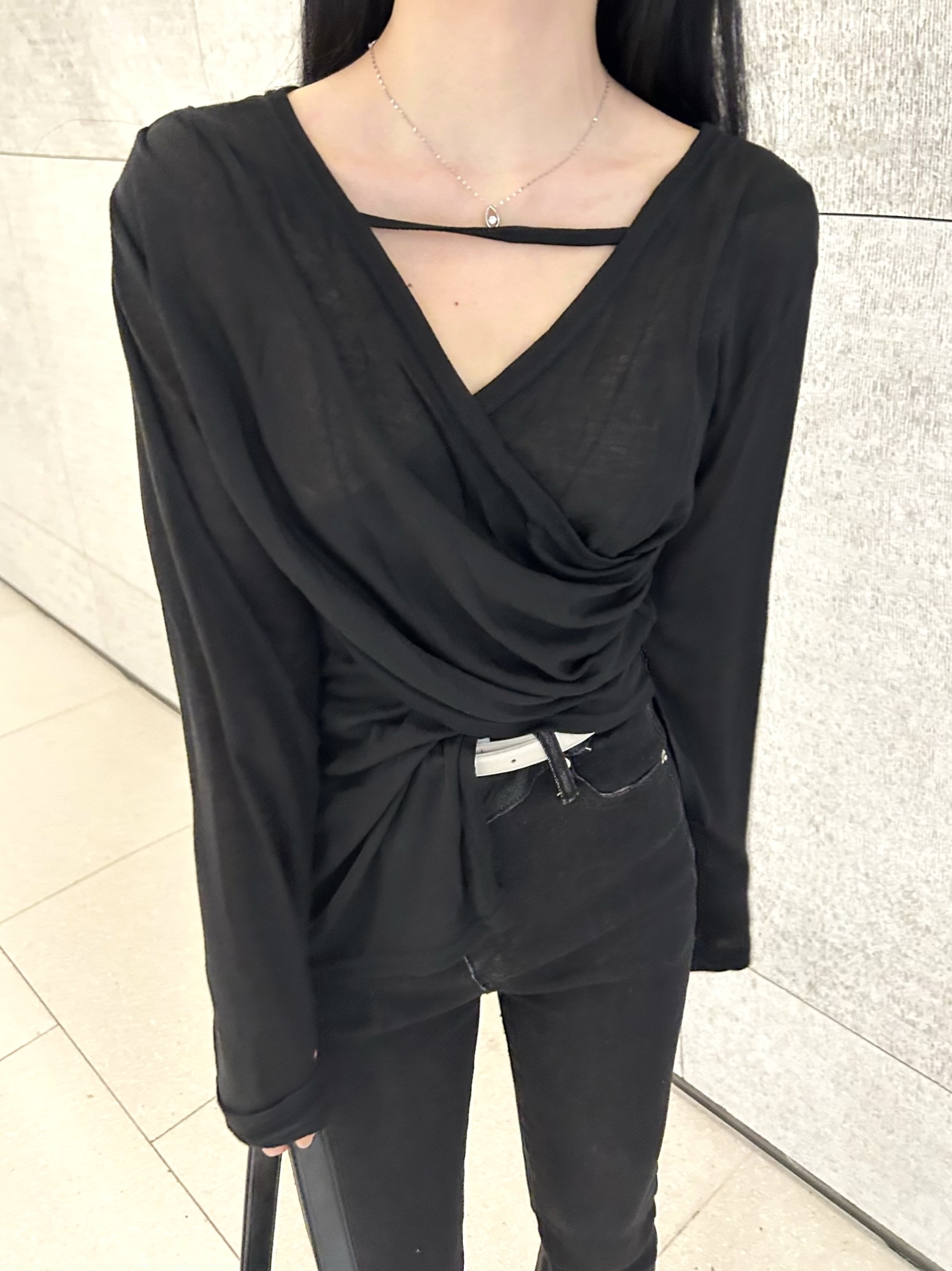 ✓ 목선과 쇄골라인이 강조되는 브이 넥 라인