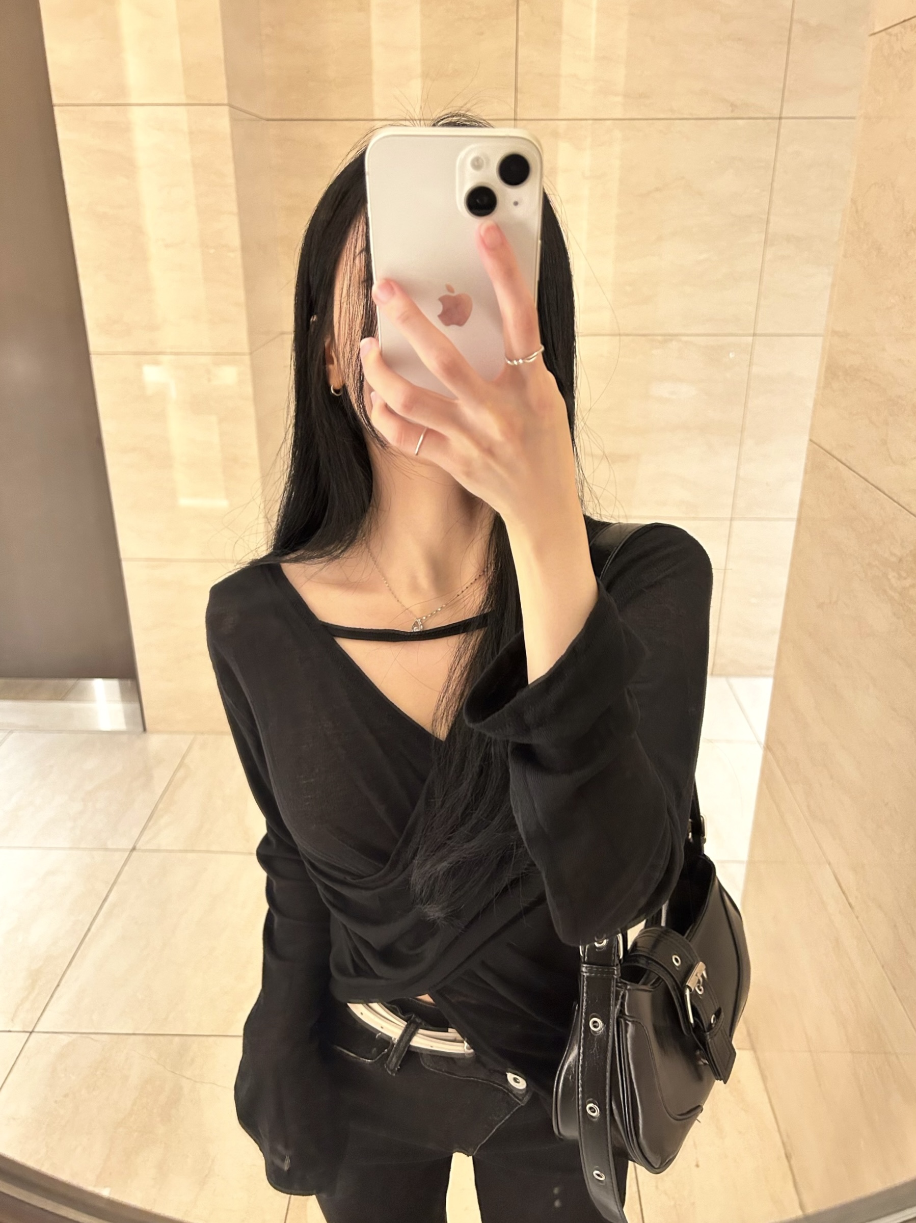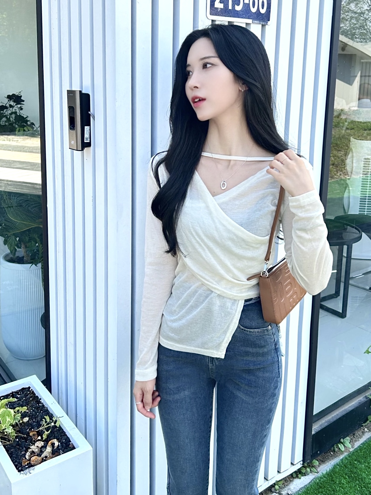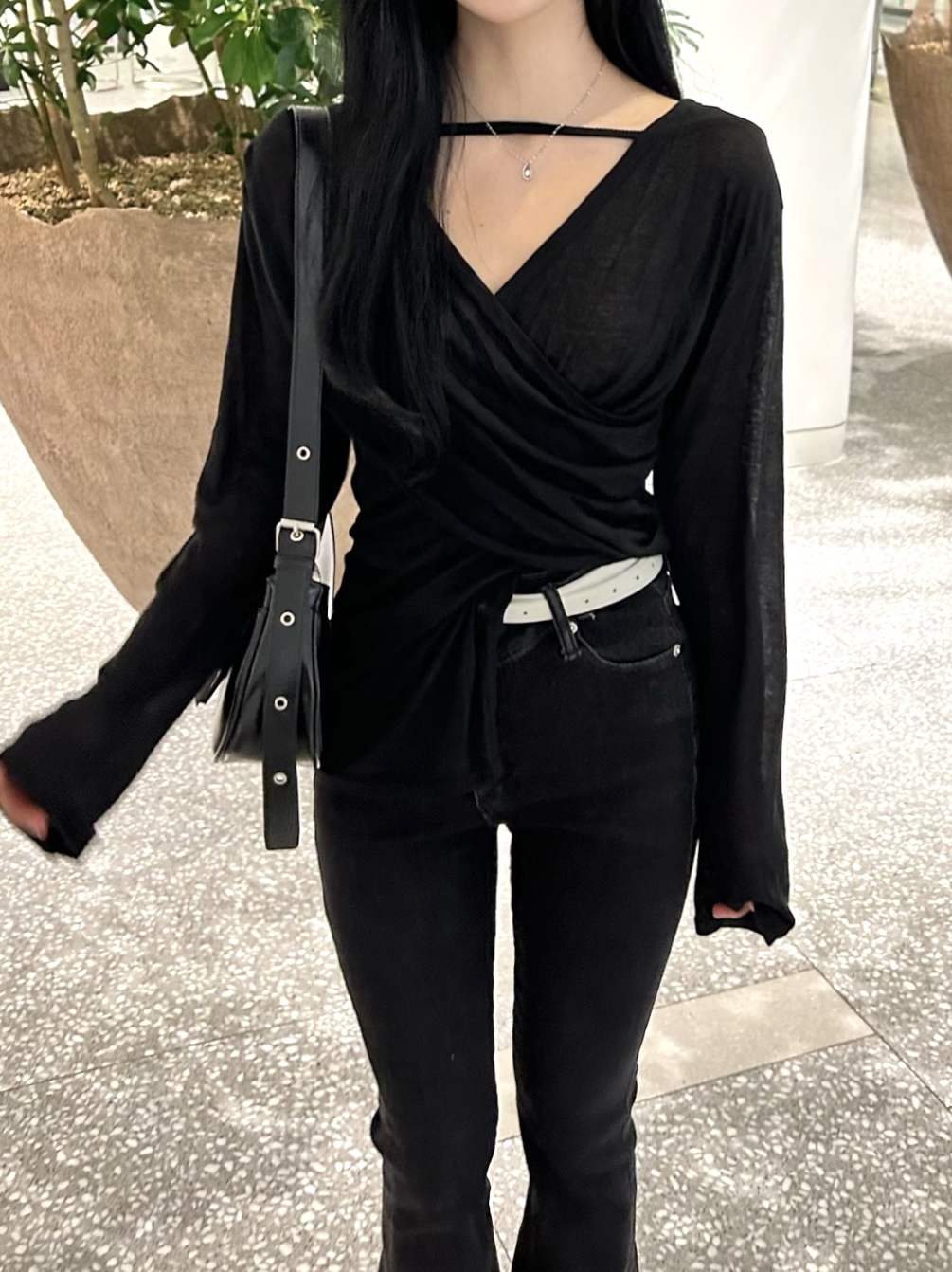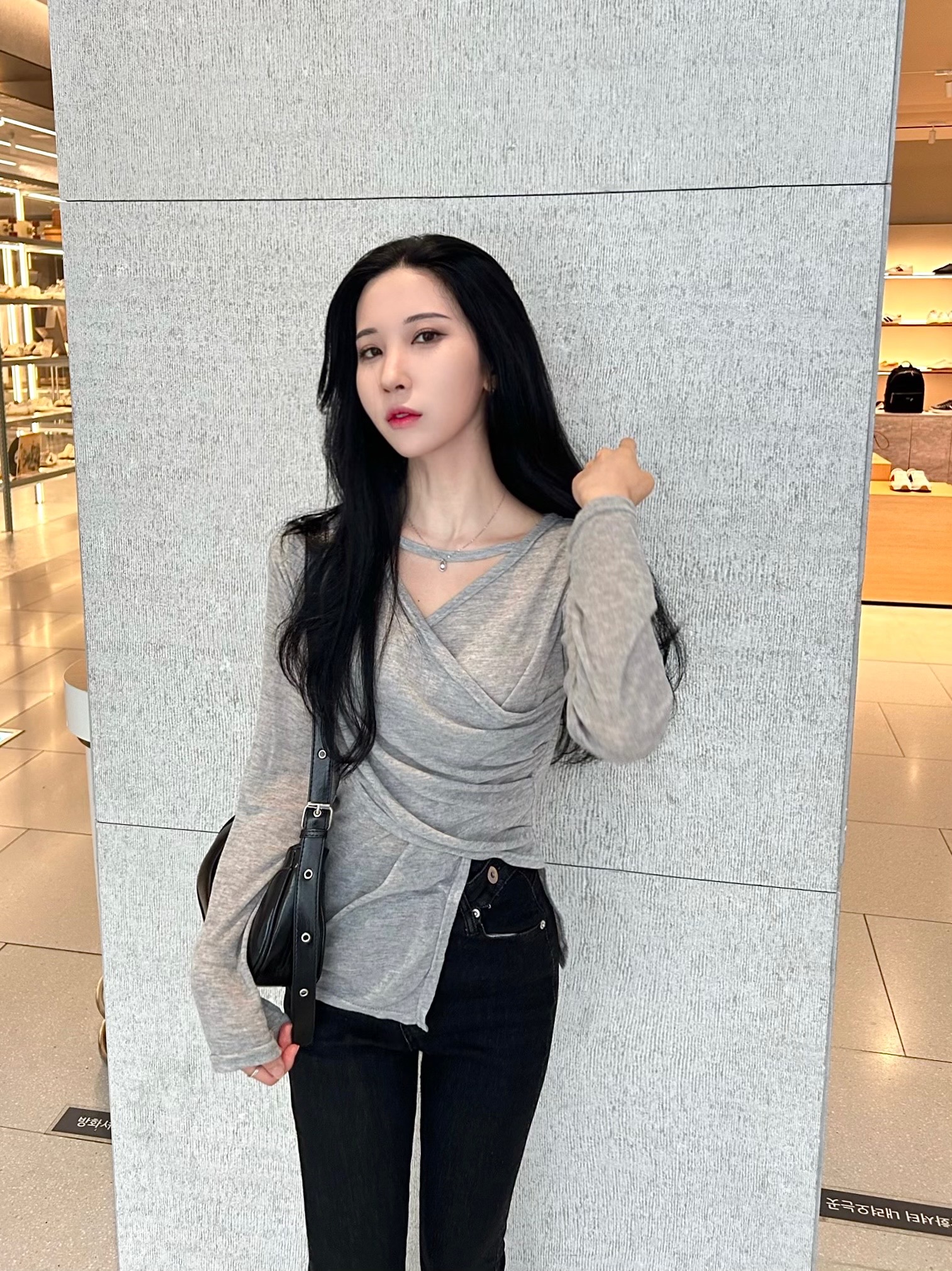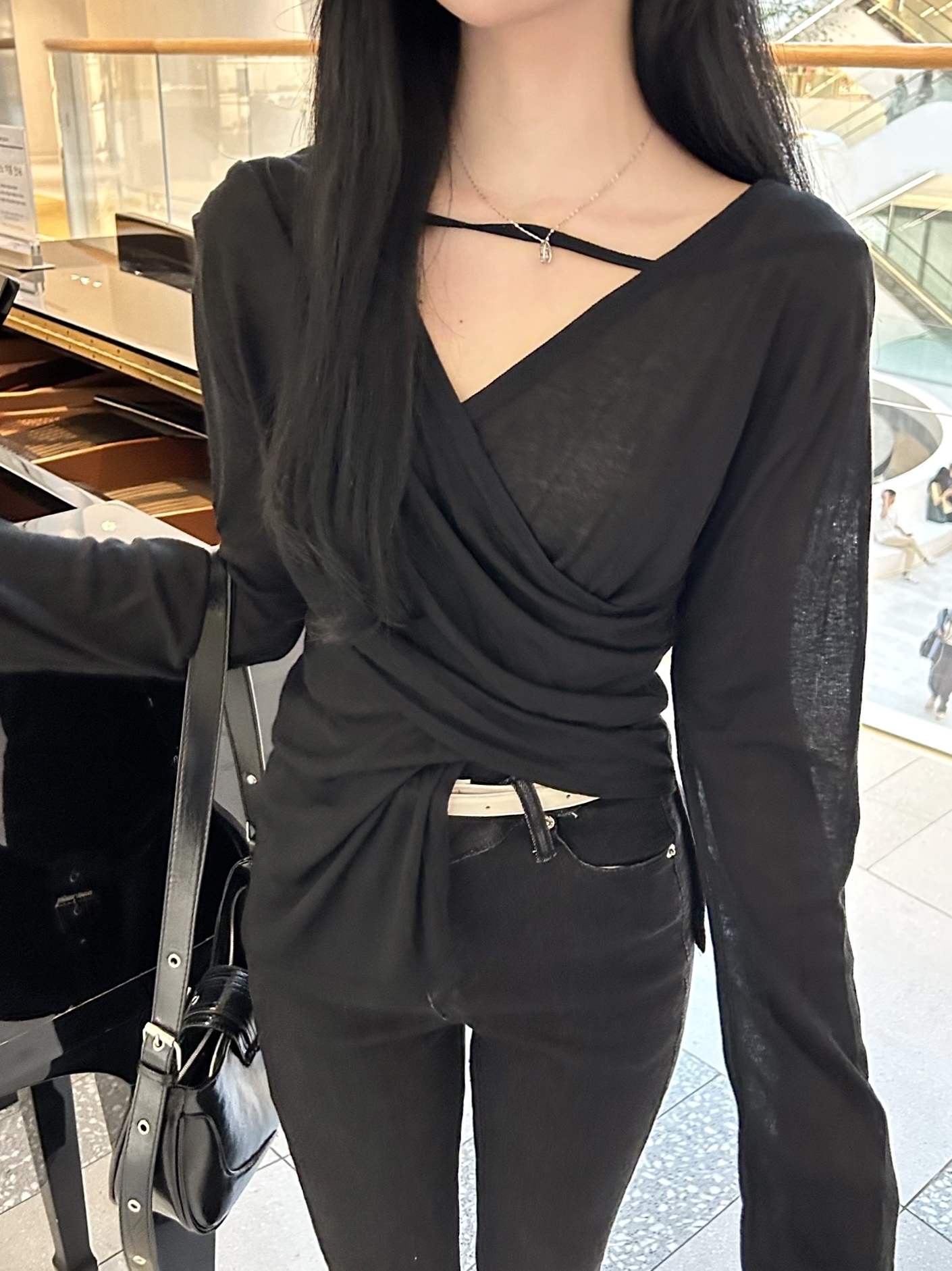 ✓ 목선과 쇄골라인이 강조되는 브이 넥 라인