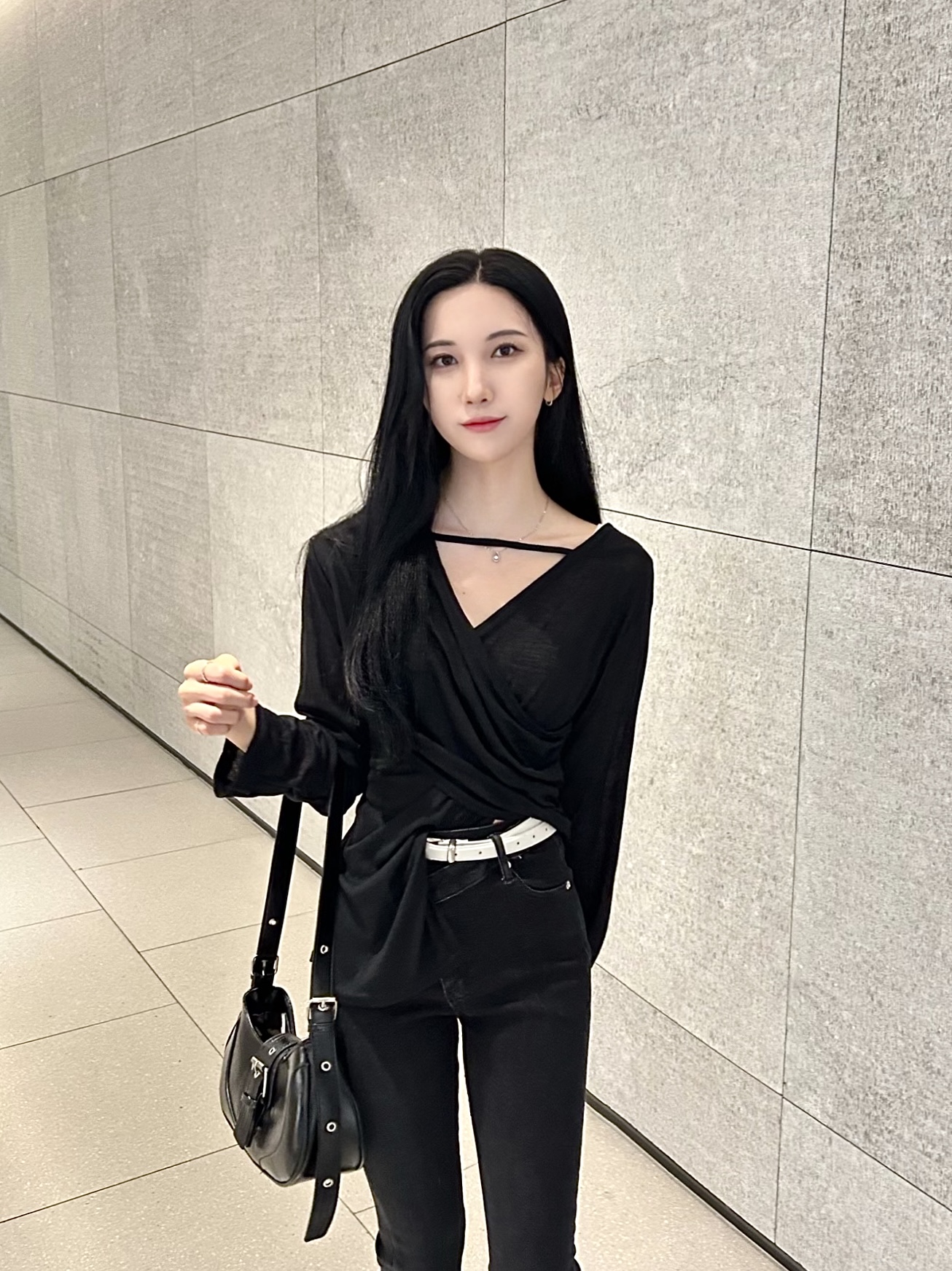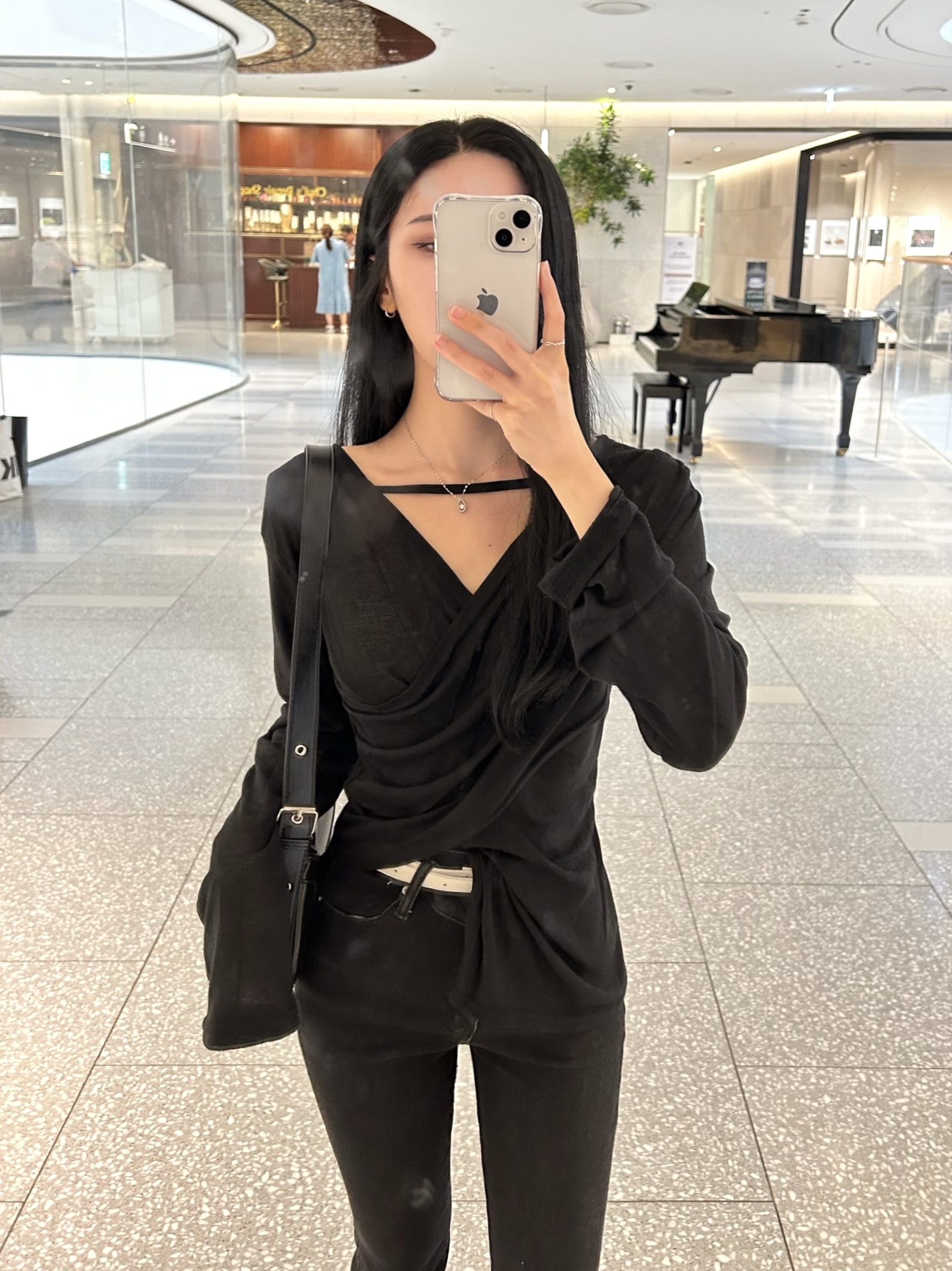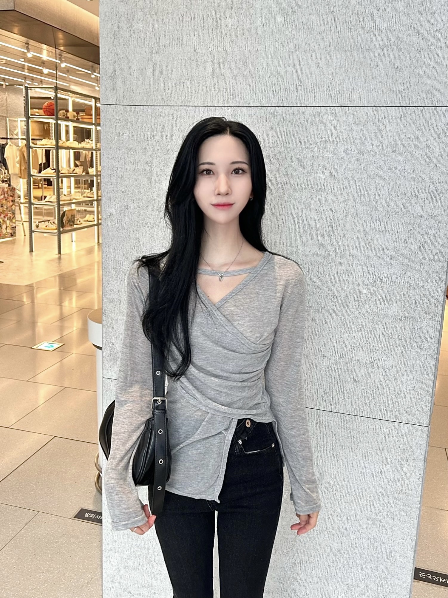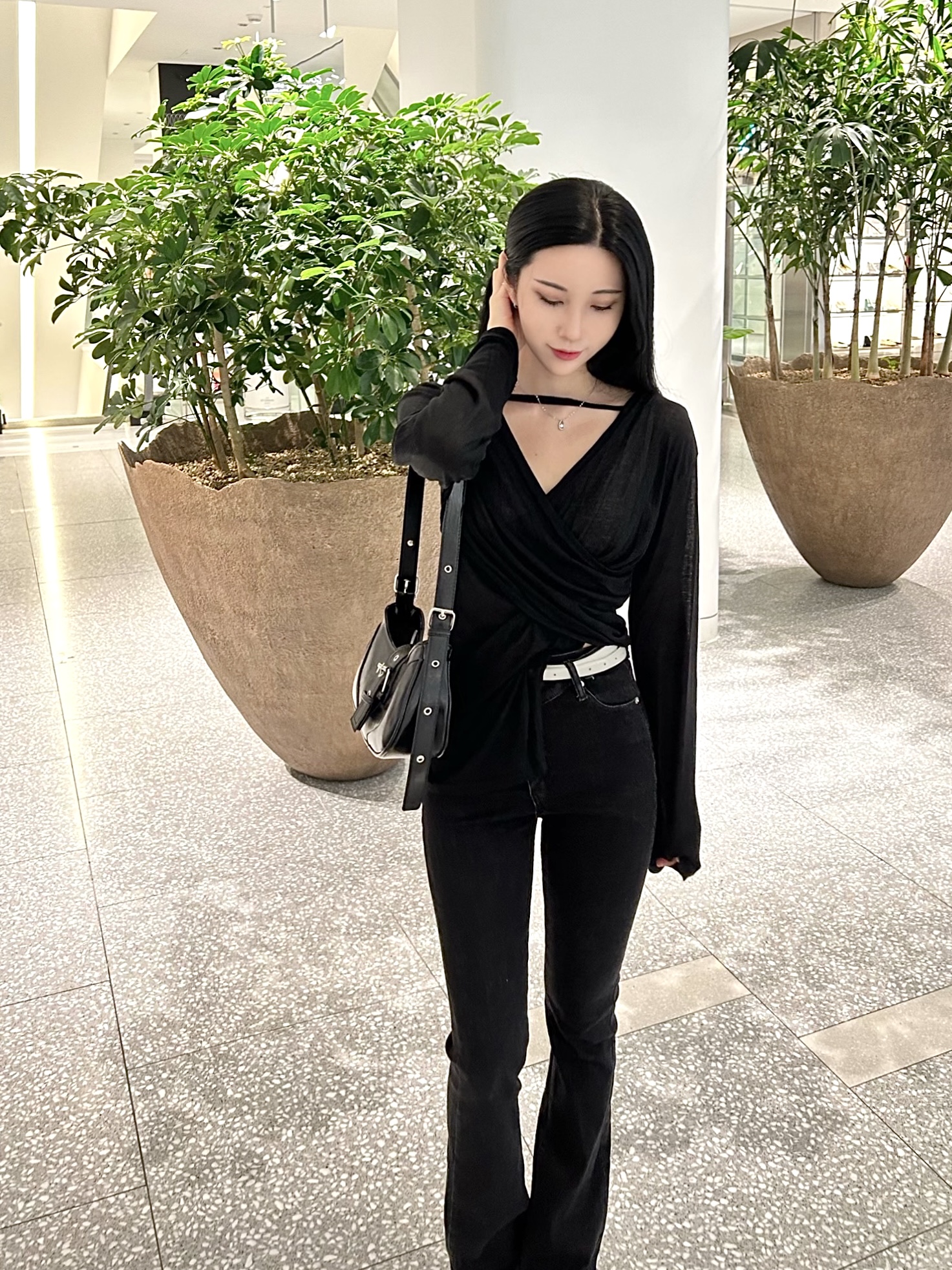 ✓ 목선과 쇄골라인이 강조되는 브이 넥 라인